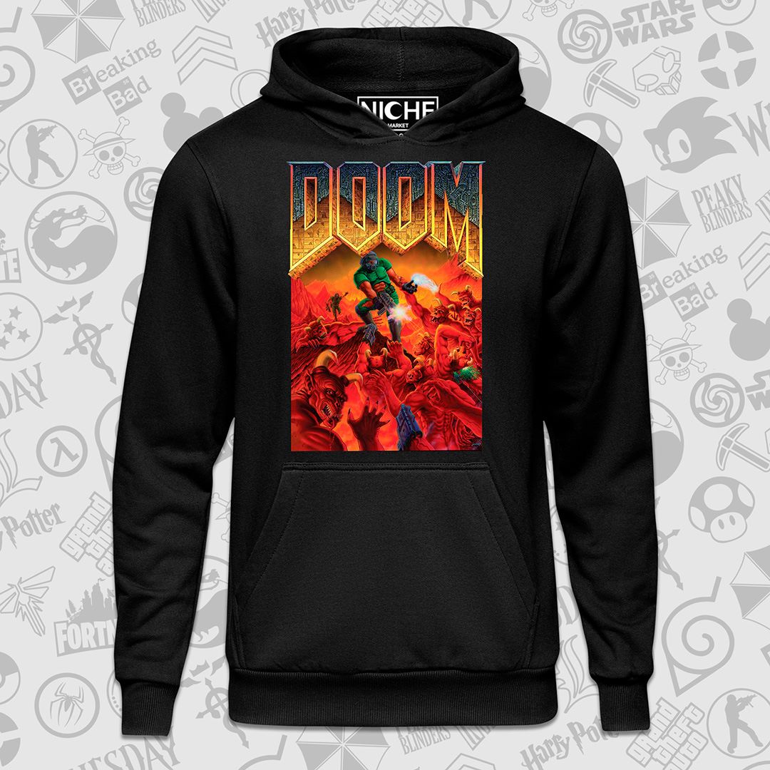 هودی مشکی Doom طرح Iconic Game Cover